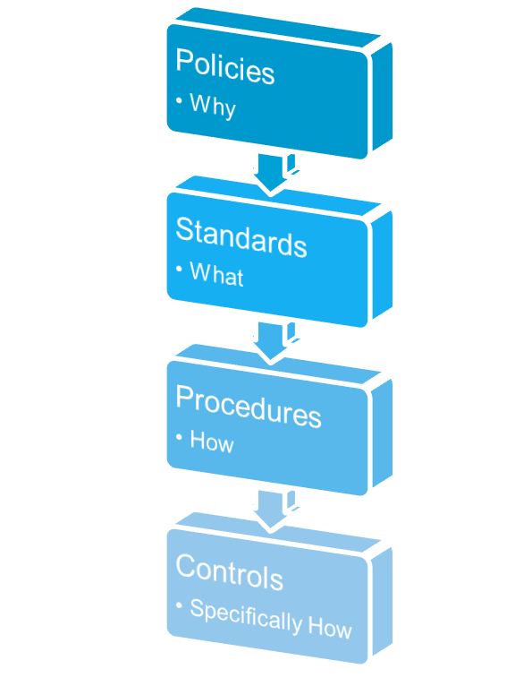 | Outline the organization’s intentions, security goals, and overall approach upon which the risk program is established and executed Provide the rationale and high-level objectives, help the organization to answer “why” Convey the amount of risk organization is willing to accept to achieve its objectives Sets forward high-level roles and responsibilities on the organizational level | Are tactical documents that provide ‘What’ on achieving directions and intent outlined by policies Support ‘parent’ policies and don’t exist in the vacuum Requirements are finite and quantifiable that could be implemented, monitored and audited Might outline more detailed roles and responsibilities relative to specific requirements Provide a blueprint for control design |