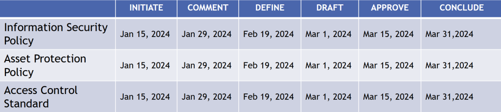 - Avoid adding implementation details (Standards or Procedures) in Policies