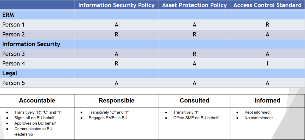 The RACI model helps track who’s involved with each policy and in what capacity.