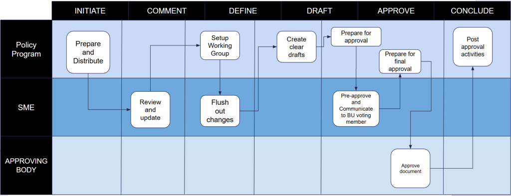 It starts with initiation, where the policy is prepared and distributed for review, then moves through commenting, definition, and drafting as subject-matter experts collaborate and refine the content.