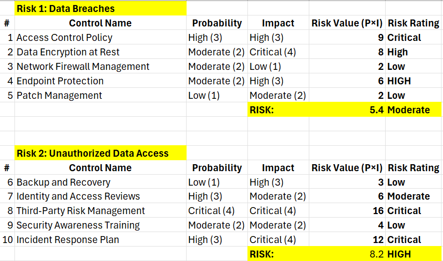 - Asset 1 + Control 1 Risk score is Low x High = 3 (Moderate Risk)